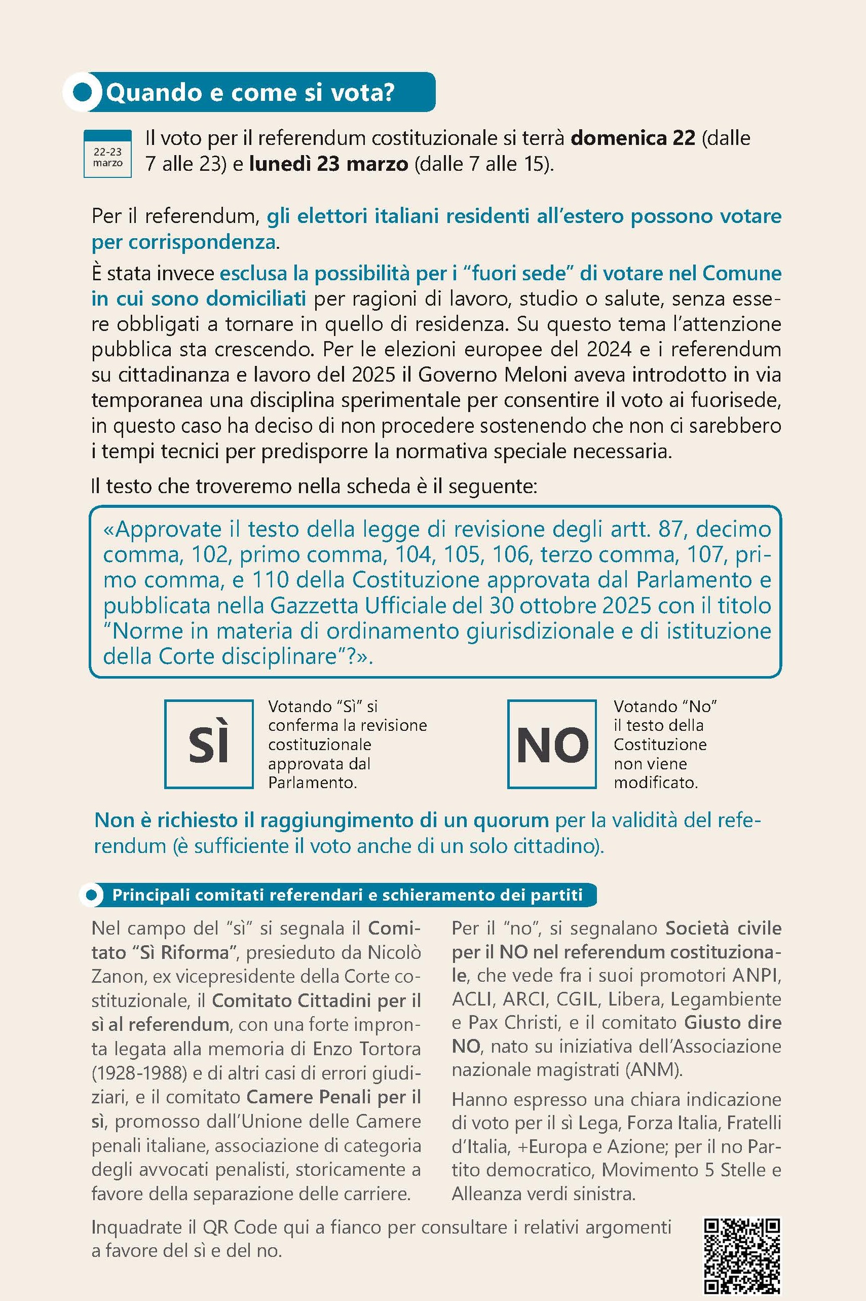 Le campagne referendarie promosse dai comitati per il sì e per il no pongono l’accento sulla separazione delle carriere tra giudici e pubblici ministeri, da decenni oggetto di dibattito nel nostro Paese. In passato siamo stati già chiamati a esprimerci su questo tema attraverso tre referendum abrogativi (1997, 2000 e 2022), che non hanno mai raggiunto il quorum necessario per la validità. Nel caso del voto del 22 e 23 marzo però, dato che si tratta di un referendum costituzionale, i cittadini sono chiamati a confermare o rigettare una modifica votata dal Parlamento e l’orientamento espresso dalla maggioranza sarà decisivo, indipendentemente da quanti elettori avranno votato. Per questo, l’astensione non è una strategia politica possibile (per quanto discutibile), come nel caso dei referendum abrogativi.