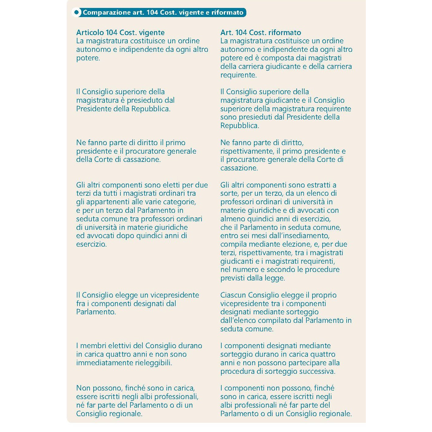 Come si può vedere dal testo dell’art. 104 Cost. modificato dalla riforma, che si attuerebbe con la vittoria del sì, i magistrati verrebbero distinti in due categorie, «della carriera giudicante e della carriera requirente», comunque riuniti nella magistratura come «ordine autonomo e indipendente da ogni altro potere», e si prevede la costituzione di due Consigli superiori distinti. Per entrambi si riaffermano i membri di diritto: il Presidente della Repubblica come presidente di entrambi gli organi, il primo presidente e il procuratore generale della Corte di cassazione come membri di diritto dei rispettivi Consigli.
