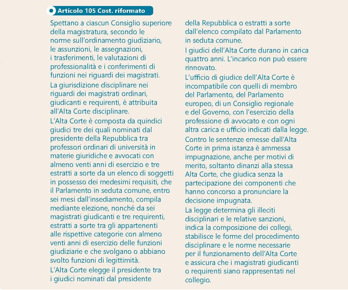 Si prevede invece che i componenti di entrambi gli organi, sempre con un incarico della durata di quattro anni, siano per un terzo estratti a sorte «da un elenco di professori ordinari di università in materie giuridiche e di avvocati con almeno quindici anni di esercizio, che il Parlamento in seduta comune, entro sei mesi dall’insediamento, compila mediante elezione», e per due terzi estratti a sorte tra magistrati rispettivamente giudicanti e requirenti, «nel numero e secondo le procedure previsti dalla legge». Si prevede poi che ciascun Consiglio elegga il proprio vicepresidente tra i componenti laici. Il testo della riforma non dà ulteriori dettagli su numeri e procedure di sorteggio, rimandando tutto alle successive leggi ordinarie di attuazione. Per quanto riguarda le funzioni dei nuovi CSM, la disciplina si trova nell’art. 105 Cost. Il primo comma come da riforma riproduce l’unico comma del testo vigente, sostituendo «promozioni» con «valutazioni di professionalità» e «conferimenti di funzioni» (si tratta del semplice svolgimento secondo la legislazione attuale del tema delle promozioni). La riforma invece elimina il riferimento ai provvedimenti disciplinari, a cui vengono dedicati i successivi nuovi sette commi. Si stabilisce infatti che per la giurisdizione disciplinare di tutti i magistrati ordinari, giudicanti e requirenti, è competente un nuovo organo: l’Alta Corte disciplinare. Il terzo comma del testo riformato prevede che sia composta di quindici giudici, in carica per quattro anni, di cui tre nominati dal Presidente della Repubblica «tra professori ordinari di università in materie giuridiche e avvocati con almeno venti anni di esercizio», tre estratti a sorte «da un elenco di soggetti in possesso dei medesimi requisiti, che il Parlamento in seduta comune, entro sei mesi dall’insediamento, compila mediante elezione», sei magistrati giudicanti e tre requirenti «estratti a sorte tra gli appartenenti alle rispettive categorie con almeno venti anni di esercizio delle funzioni giudiziarie e che svolgano o abbiano svolto funzioni di legittimità». Il presidente dell’Alta Corte viene eletto tra i membri nominati dal Presidente della Repubblica o tra quelli estratti a sorte dall’elenco compilato dal Parlamento. Si prevedono poi una serie di incompatibilità per chi svolge l’ufficio di giudice dell’Alta Corte. Il settimo comma del testo riformato prevede poi che le sentenze disciplinari possano essere impugnate non più in Cassazione, ma «soltanto dinanzi alla stessa Alta Corte, che giudica senza la partecipazione dei componenti che hanno concorso a pronunciare la decisione impugnata». È interamente demandata a successive leggi ordinarie (approvabili dunque anche solo dalla maggioranza di Governo) la determinazione dei dettagli sugli illeciti disciplinari, le relative sanzioni, la composizione dei collegi, le forme del procedimento disciplinare e le norme necessarie per il funzionamento della Corte, assicurando che i magistrati giudicanti o requirenti siano rappresentati nel collegio.